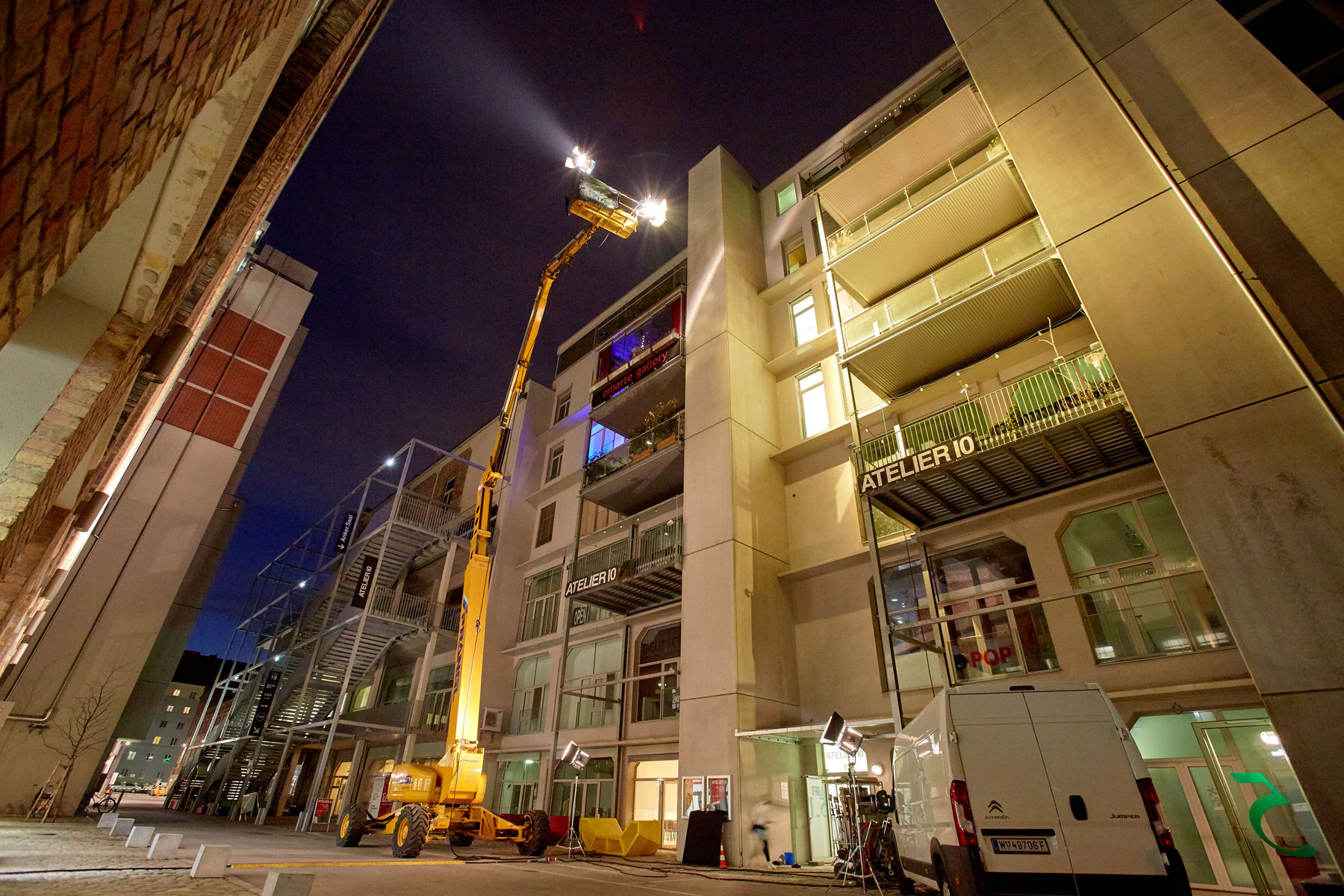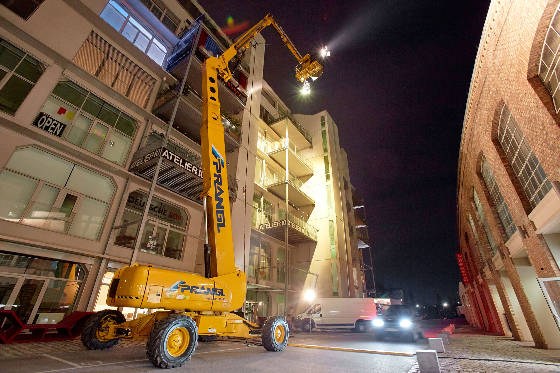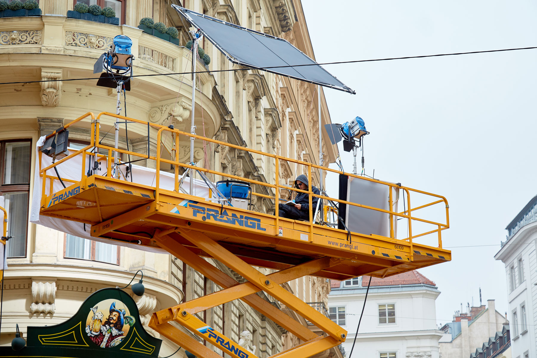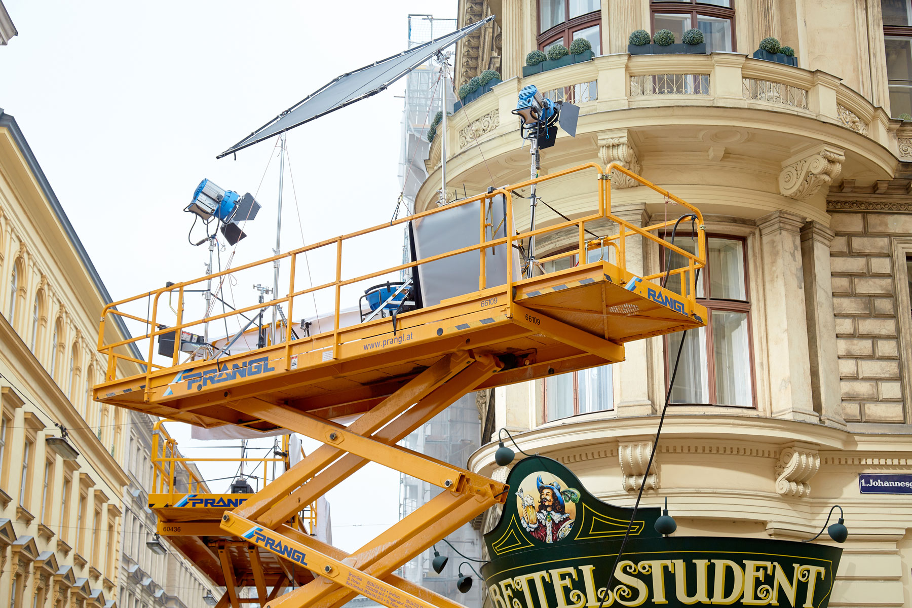 U roku od godine dana na austrijskoj televiziji ORF prikazat će se epizoda serije Tatort radnog naslova Die Faust (Pesnica). Između ostalog, optimalno osvjetljenje osiguravale su različite radne platforme tvrtke Prangl. Pri snimanju osam različitih scena korišten je jako raznolik vozni park: 5 škarastih radnih platformi od 15 metara, 2 škaraste platforme od 10 metara i jedna zglobna radna platfoma od 43 metra.