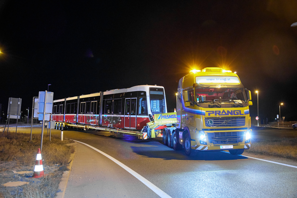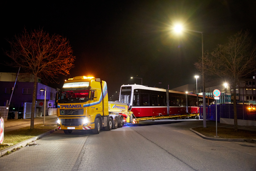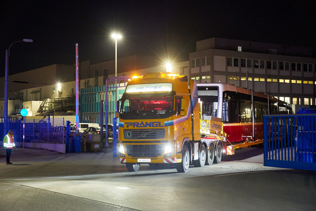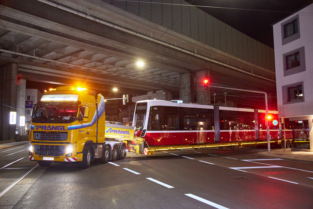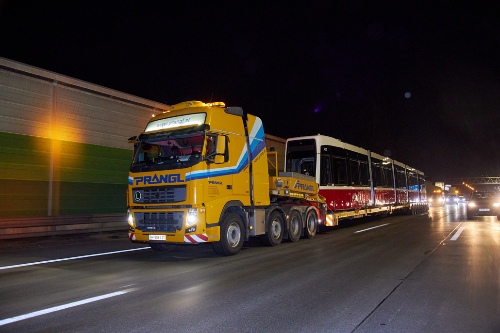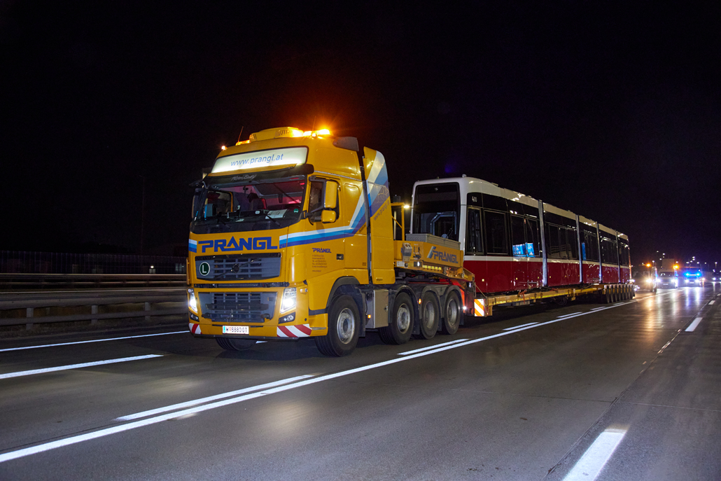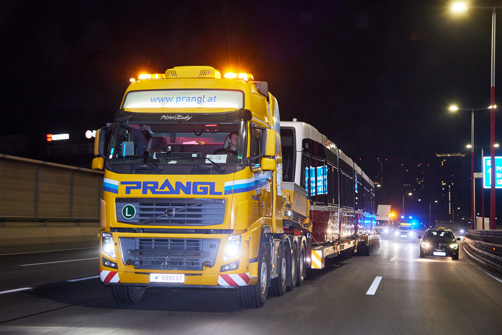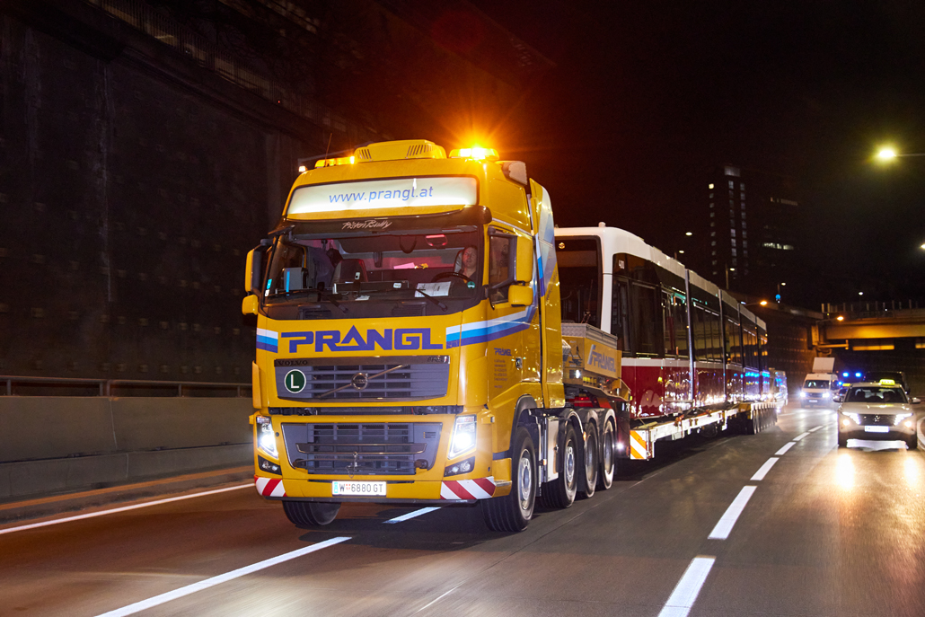 Bečki Flexity tramvaj dug je 34 metra, može primiti 211 putnika, potpuno je prilagođen osobama s invaliditetom i opremljen je najnovijom tehnologijom. Prangl u svom voznom parku ima posebnu kombinaciju vozila za prijevoz tako zahtjevnih tereta s jedne lokacije na drugu: tegljač u kombinaciji sa posebno prilagođenim transportnim vozilom za željezničke vagone. Ova kombinacija stekla je izvrstan ugled tijekom godina i u brojnim usporedivim projektima - posebno u Beču - te se redovito koristi za prijevoz Flexity tramvaja, jer se pokazala vrlo okretnom i lakom za manevriranje u urbanim područjima.