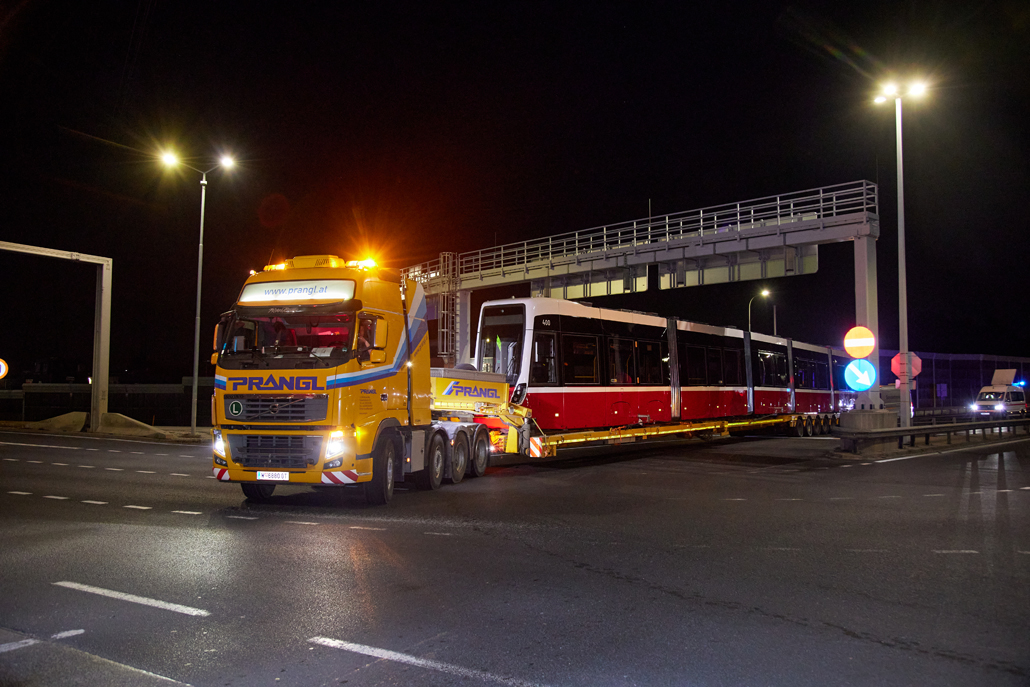 Za prijevoz vagona Flexity, Prangl je koristio posebnu kombinaciju vozila, koja je prvo u skraćenoj verziji dovezena na tramvajski kolodvor Donaustadt. Sljedećeg dana su na licu mjesta prilagodili prikolicu kako bi utovarili 100. tramvaj Flexity. Cijeli transportni vlak dosegao je duljinu od 42,5 metara, širinu od 2,99 metara, visinu od 4,40 metara i ukupnu težinu od 99 tona. Sljedeće noći vozila su krenula, u pratnji nekoliko pomoćnih vozila, a tegljač s produženim teretom uputio se prema S2.