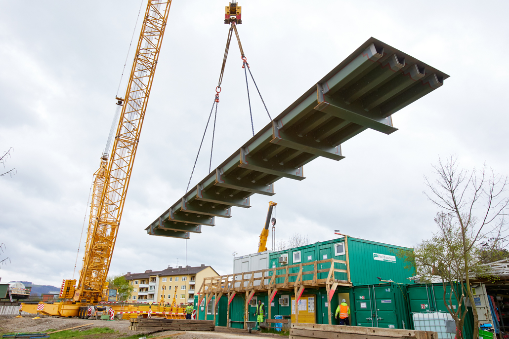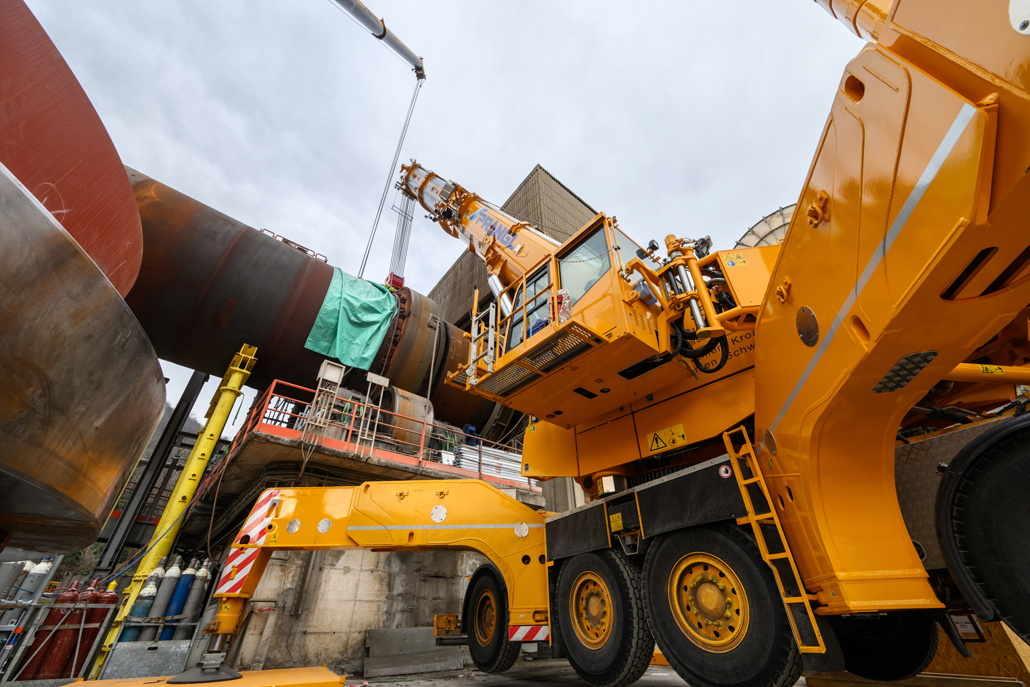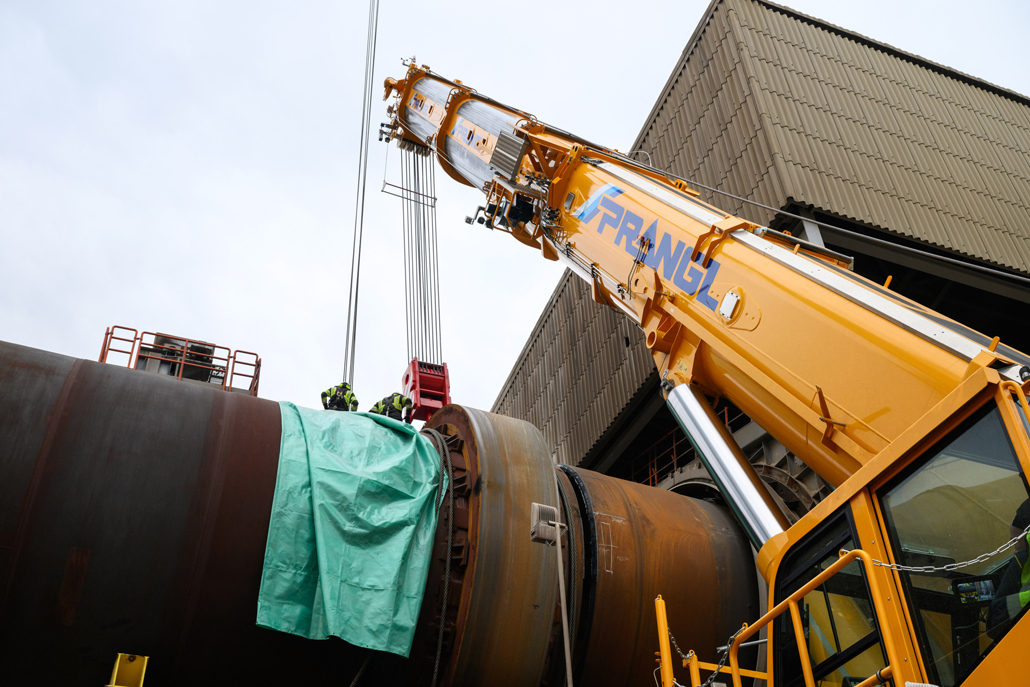 Ponovno je potporni kotač pažljivo vođen u ispravan položaj užadima s tla.Radnici su čekali zamjenski dio na oba kraja cijevi kako bi ga ugradili u malim koracima. Na kraju je novi potporni kotač zavaren natrag na cijev. Dvije autodizalice – kao i cijeli tim – radile su iznimno pouzdano: dizalica od 160 tona s radijusom od 6 metara i teleskopskom rukom od 13 metara. Div od 500 tona konfiguriran je za svoju prvu upotrebu s radijusom od 11,5 metara i teleskopskom rukom od 24 metra.