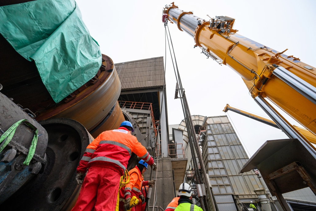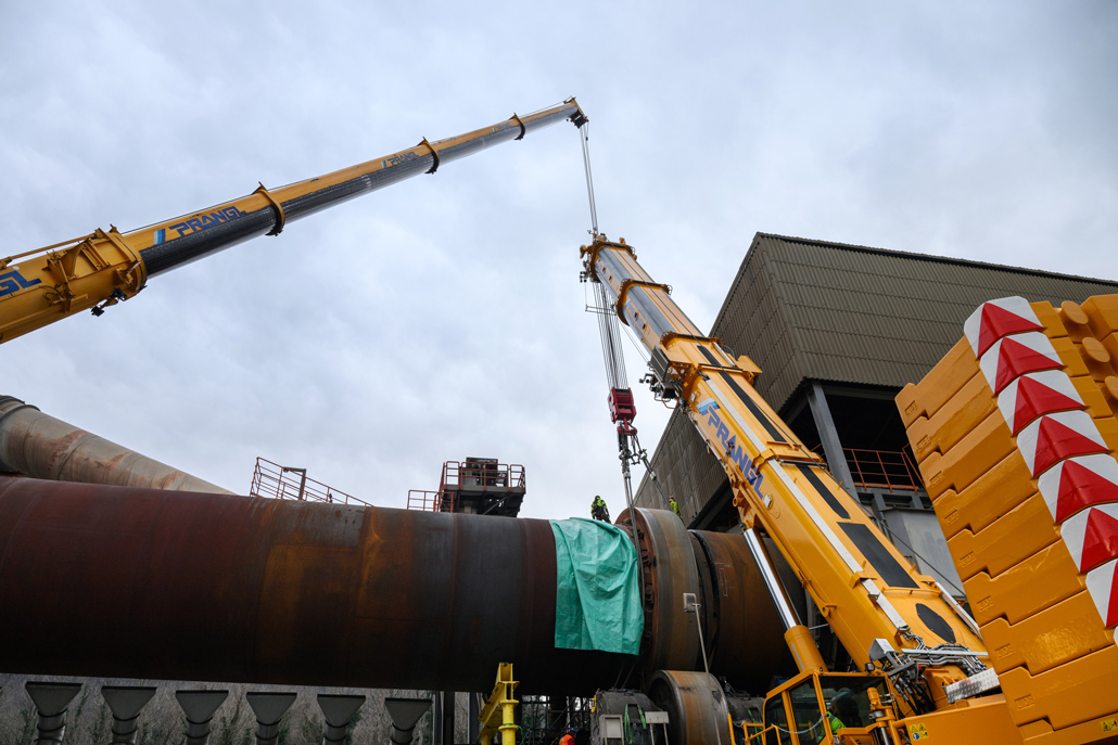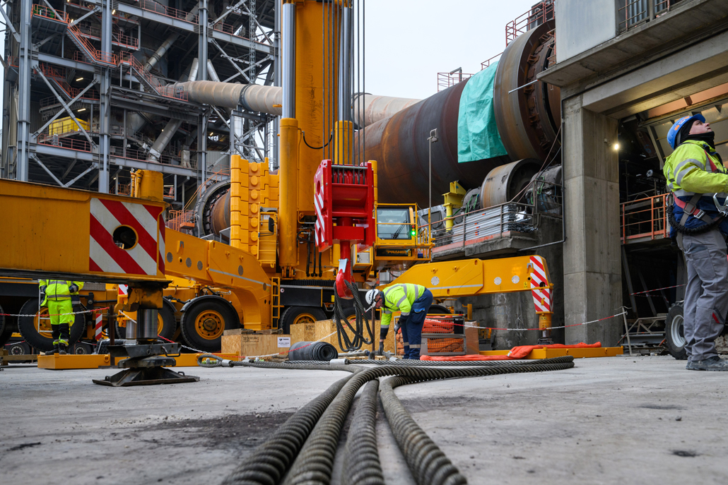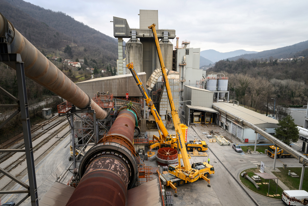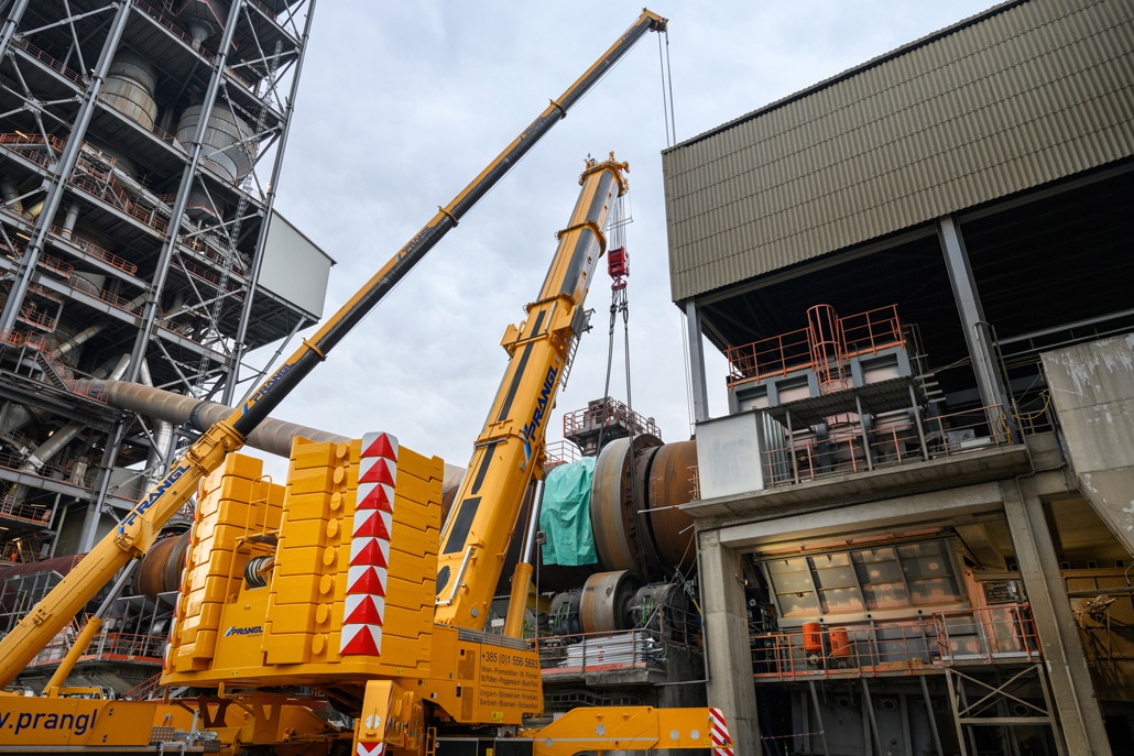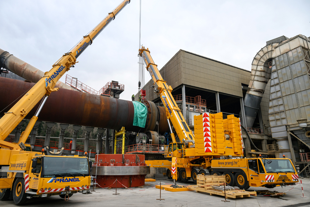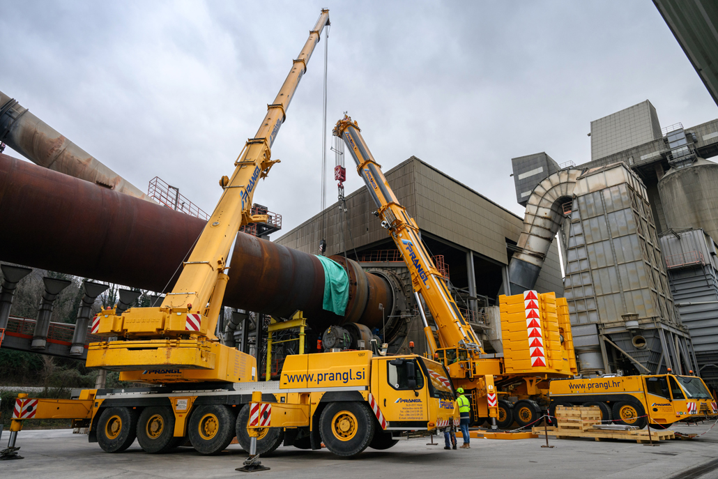 Naručitelj radova na održavanju cementare (ovo je jedina cementara u Sloveniji i najveći poslodavac u srednjem Posočju) zadatak je dodijelio žutim stručnjacima. Zaposlenici Prangla su nakon detaljne studije za glavnog izvođača ovog zadatka odabrali novu pokretnu dizalicu nosivosti 500 tona. Kao pomoćno dizalo poslužila je teleskopska dizalica od 160 tona.Tijekom osjetljivih radova na sustavu rotacijske peći proizvodnja je naravno bila zaustavljena. Prije nego što su se dizanja uopće mogla izvesti, dio cijevi je morao biti prerezan starim potpornim kotačem.