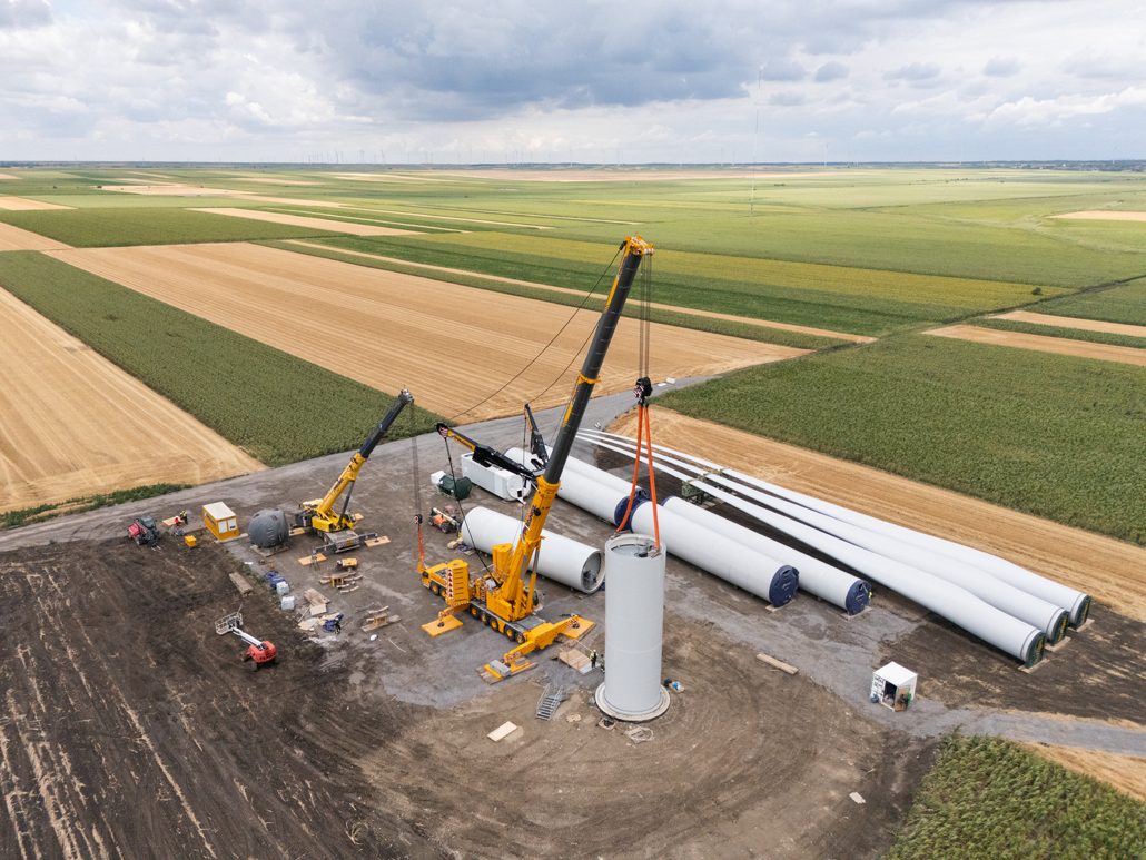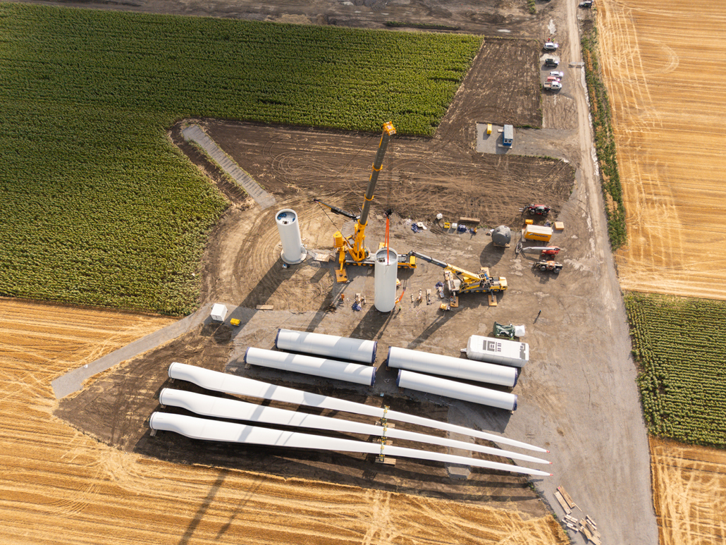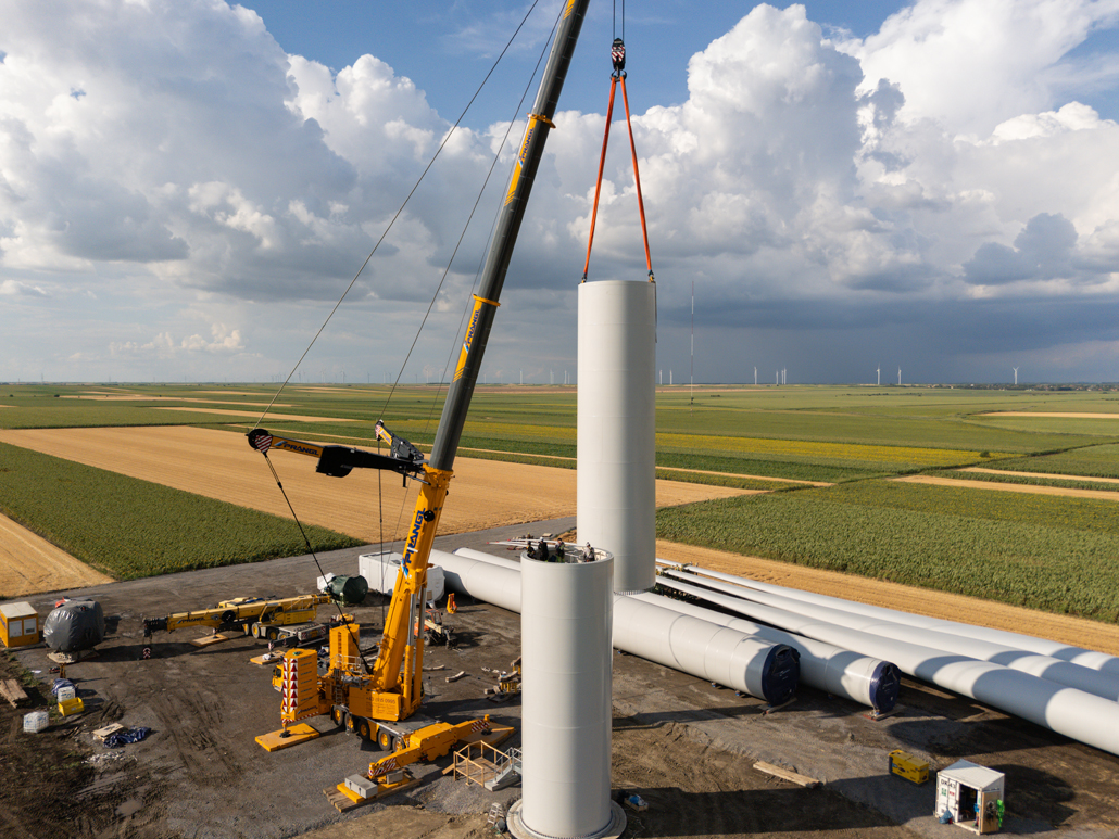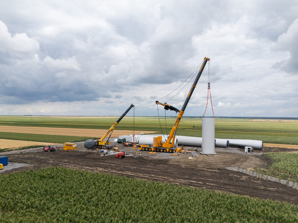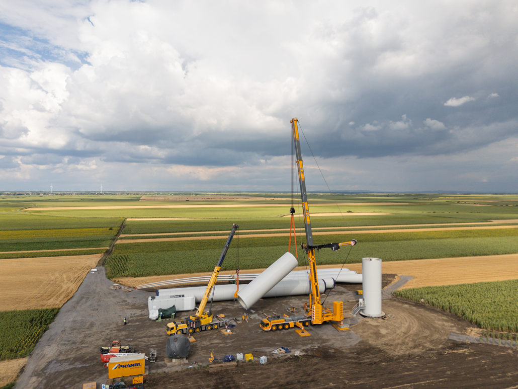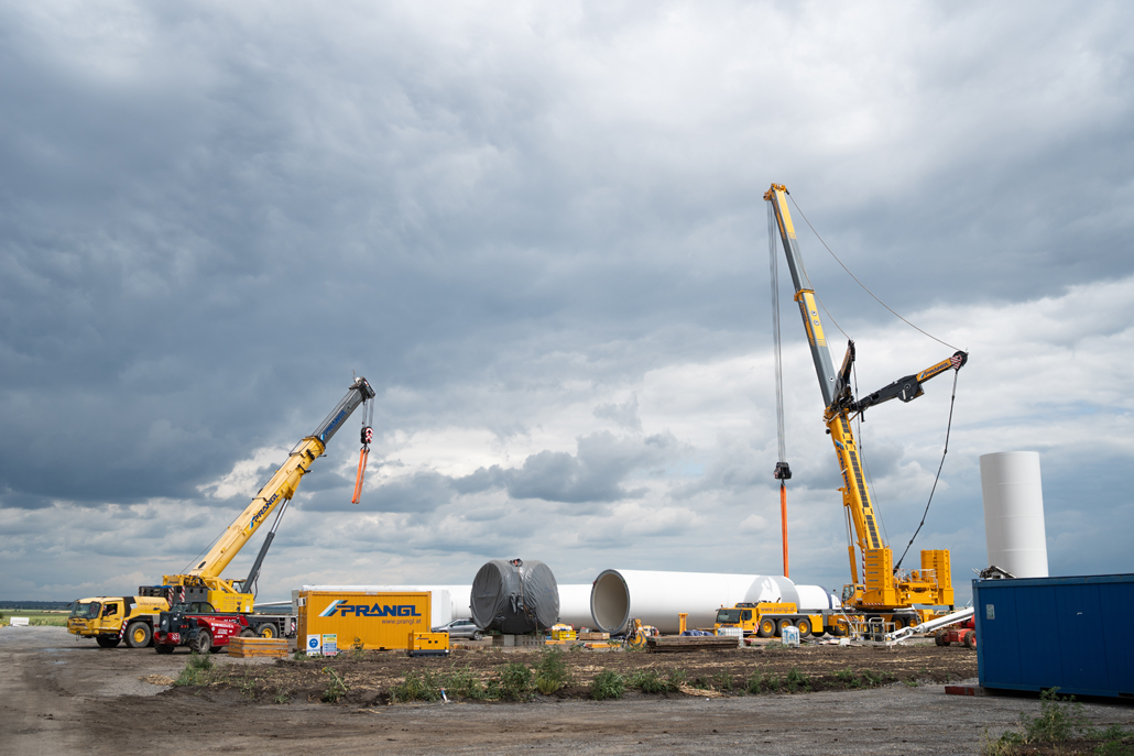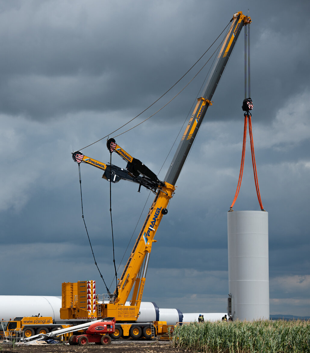 Postavljanje vjetroturbina zahtijeva visoku stručnost i preciznost. Budući da Prangl raspolaže s obje kvalitete, stručnjaci u žutim uniformama angažirani su za istovar svih dijelova – ukupno šest elemenata tornja, gondolu, pogonski sklop, pesto i rotorne lopatice – te za predmontažu dva segmenta tornja.