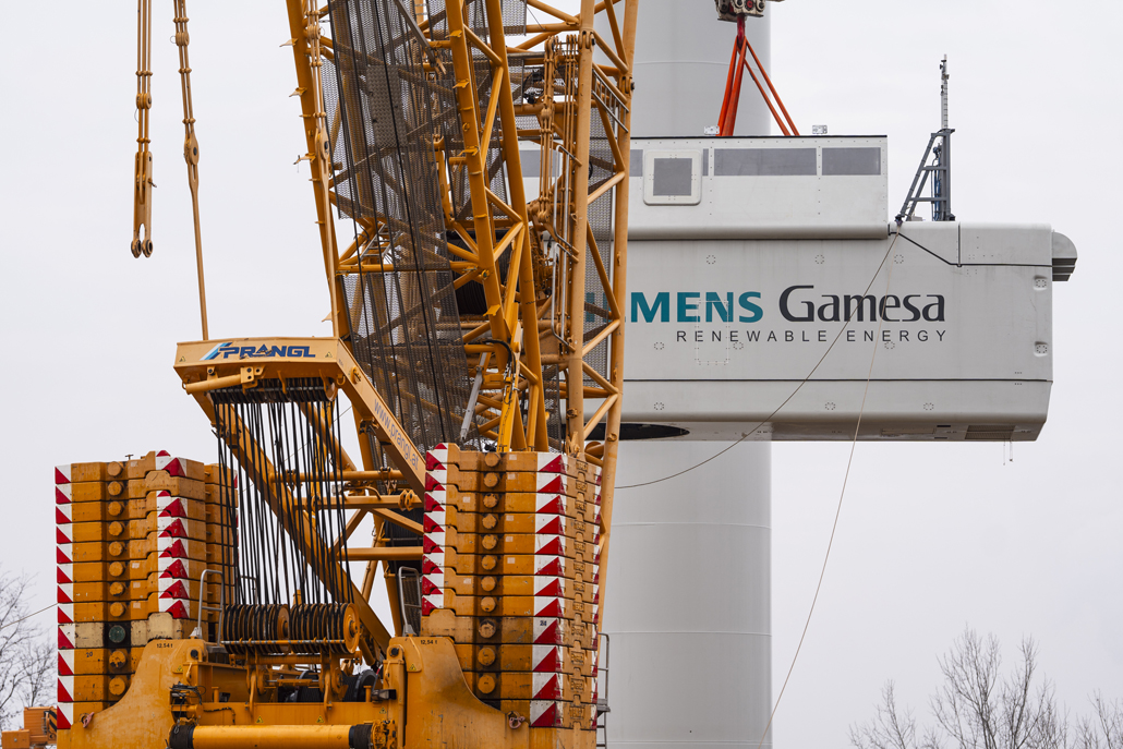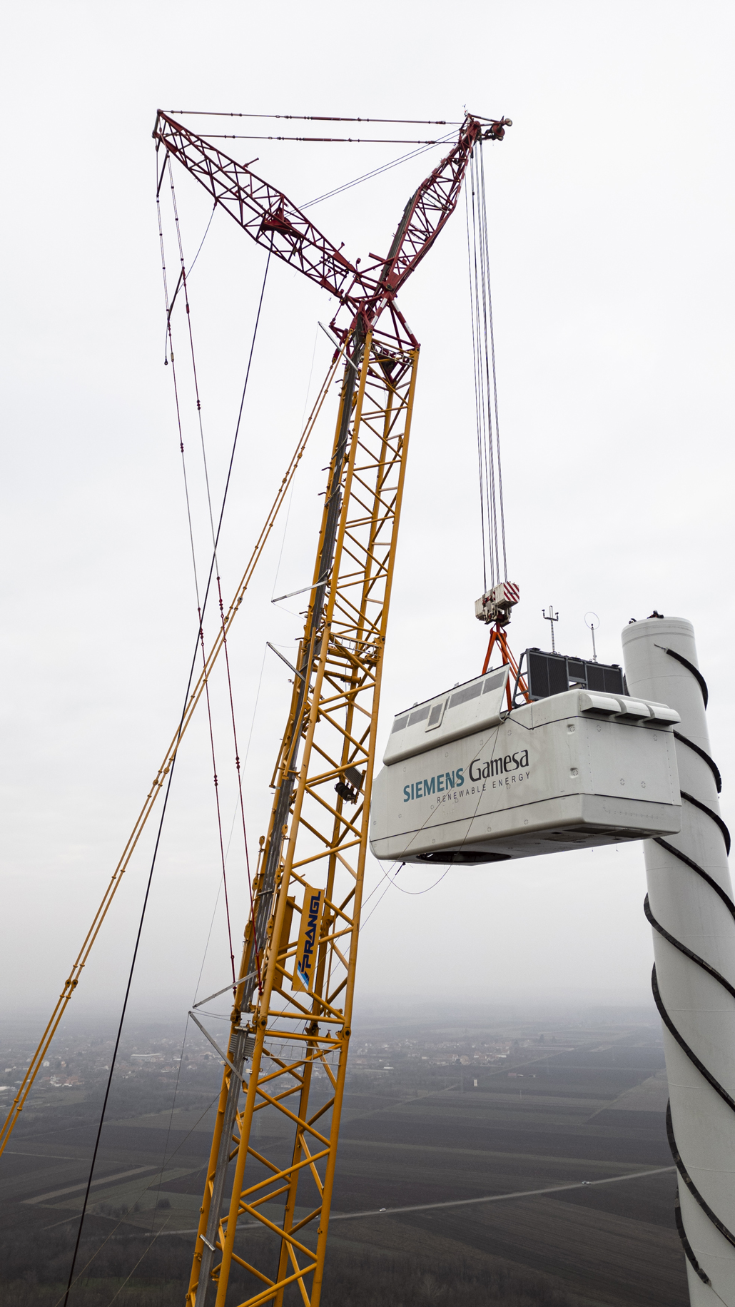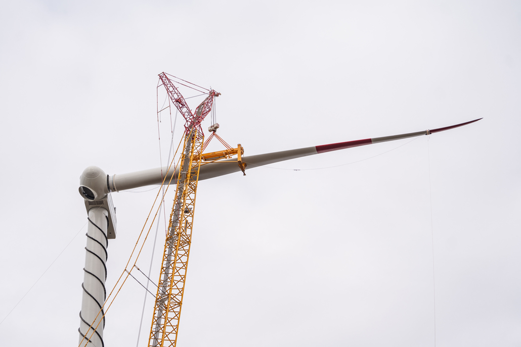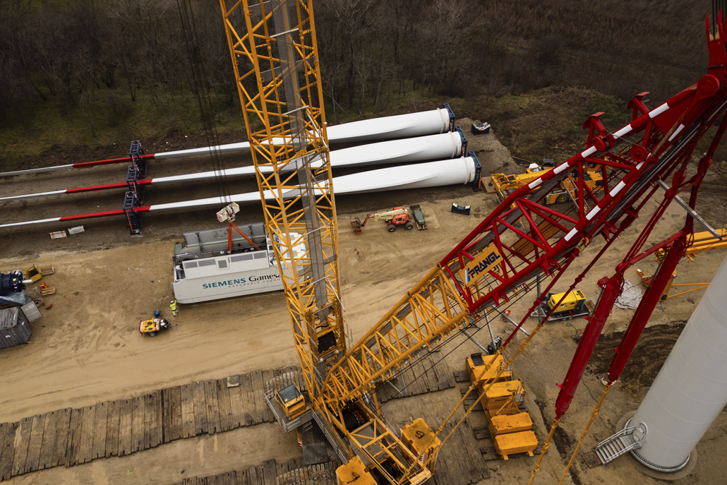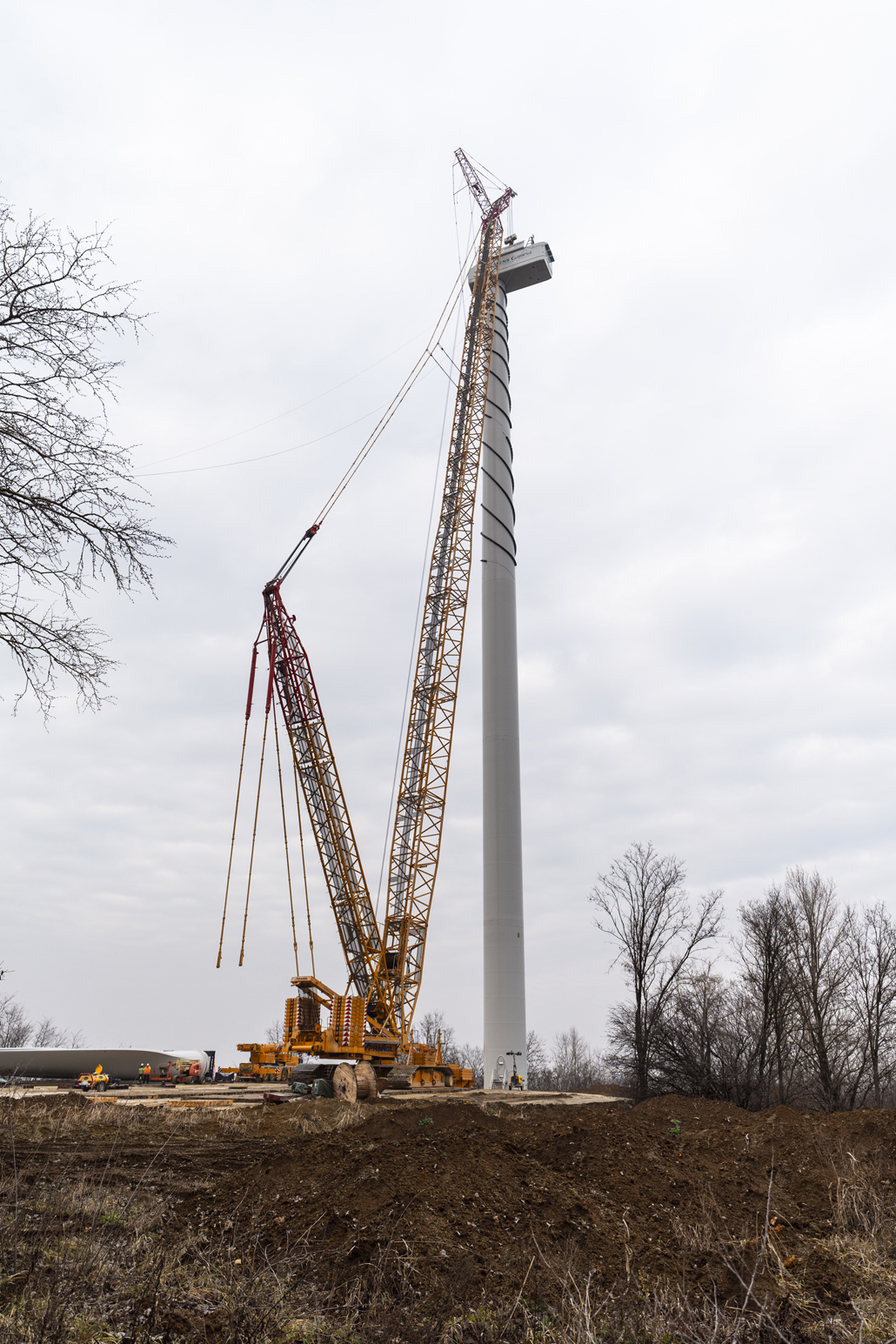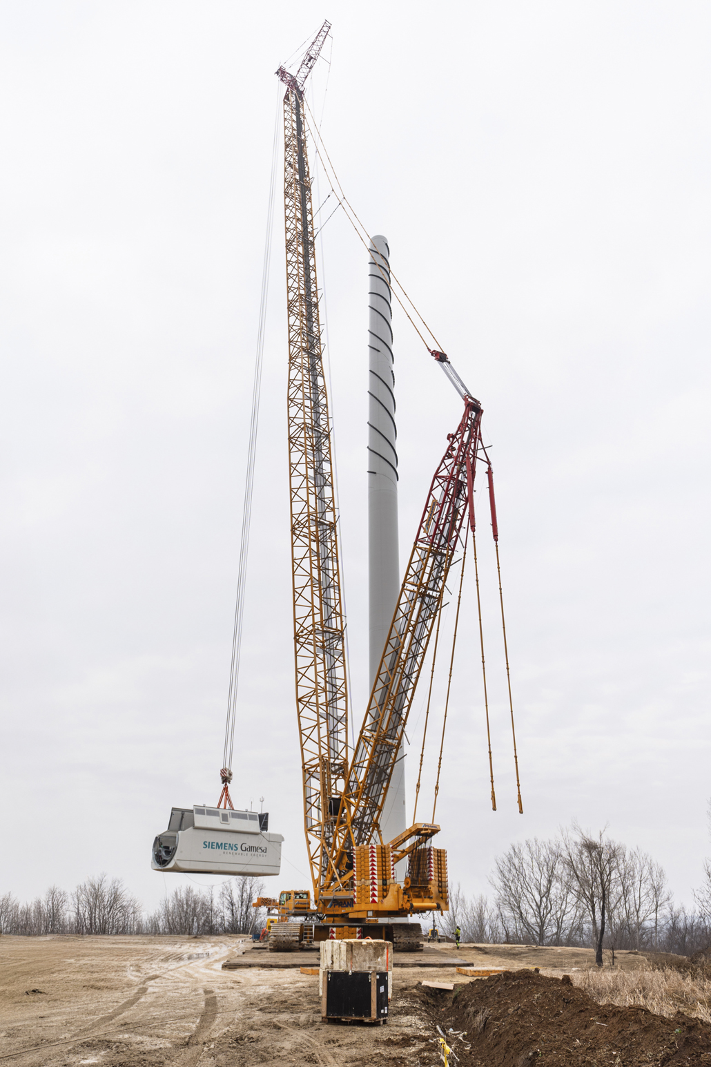Zbog svojih specifikacija, ova gusjenična dizalica sposobna je pomicati i podizati sve komponente te podizati unutar manjeg radijusa od drugih dizalica. Za svaku vjetroturbinu trebalo je ugraditi pet segmenata tornja, gondolu, glavčinu i pogonski sklop te tri lopatice. Prvi korak bio je podizanje tornja. Za ovaj zadatak osigurana je teleskopska dizalica od 200 tona. Div od 650 tona, zajedno s dizalicom od 200 tona, podigao je dijelove tornja (svaki težine 90,5 tona, 82,1 tonu, 62,5 tona, 53,9 tona i 50,5 tona) u tandemskom podizanju.