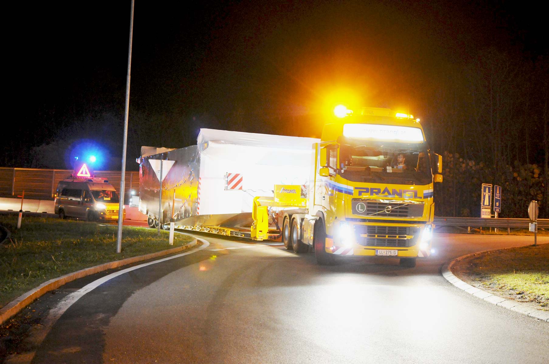 Značajno polazište za logistički koncept koji smo u konačnici i upotrijebili bio je pokušaj da se strukturni zahvati u prirodi svedu na najnižu moguću mjeru. Druge ideje s dvije iznimno velike teleskopske dizalice zahtijevale bi mnogo veće pripremne radove, a time i veći zahvat u prirodu. S dizalicom na gusjenicama koja teži 600 tona, zemljani radovi na gradilištu mogli su se održati na minimalnoj razini. Uz to smo mogli skratiti i pristupni put. Žuti kolos težio je oko 615 tona. Za postavljanje smo koristili teleskopsku dizalicu od 250 tona i teleskopski viličar od 6 tona.