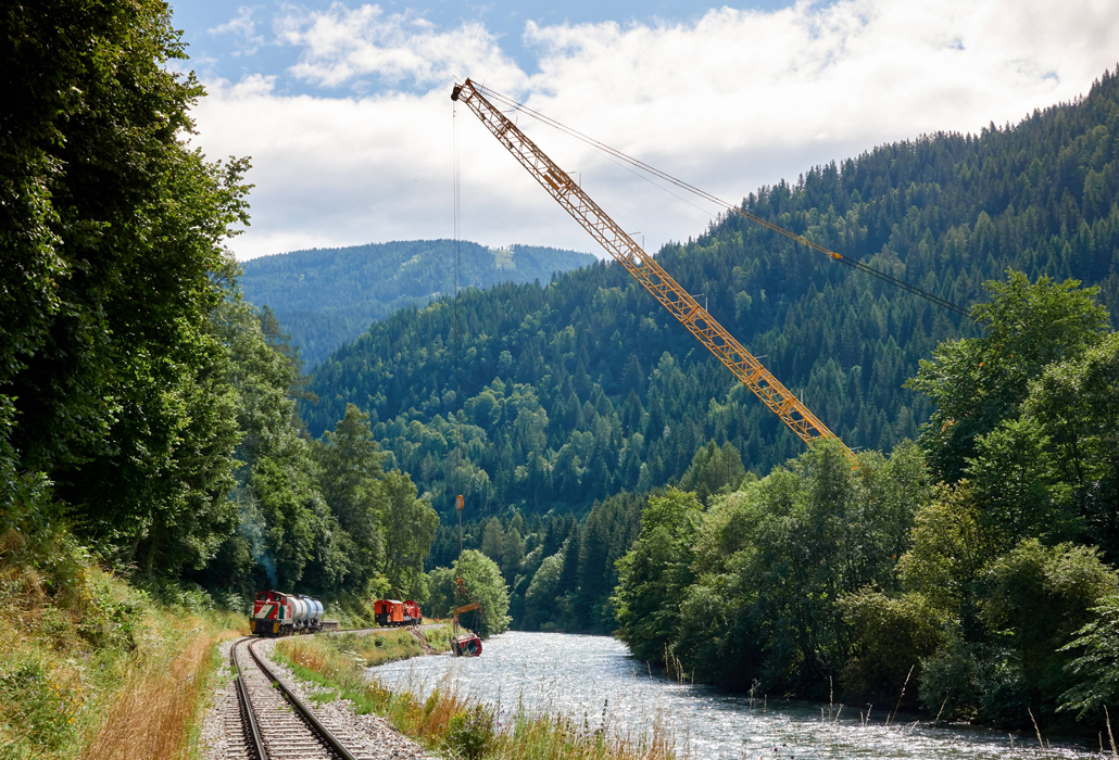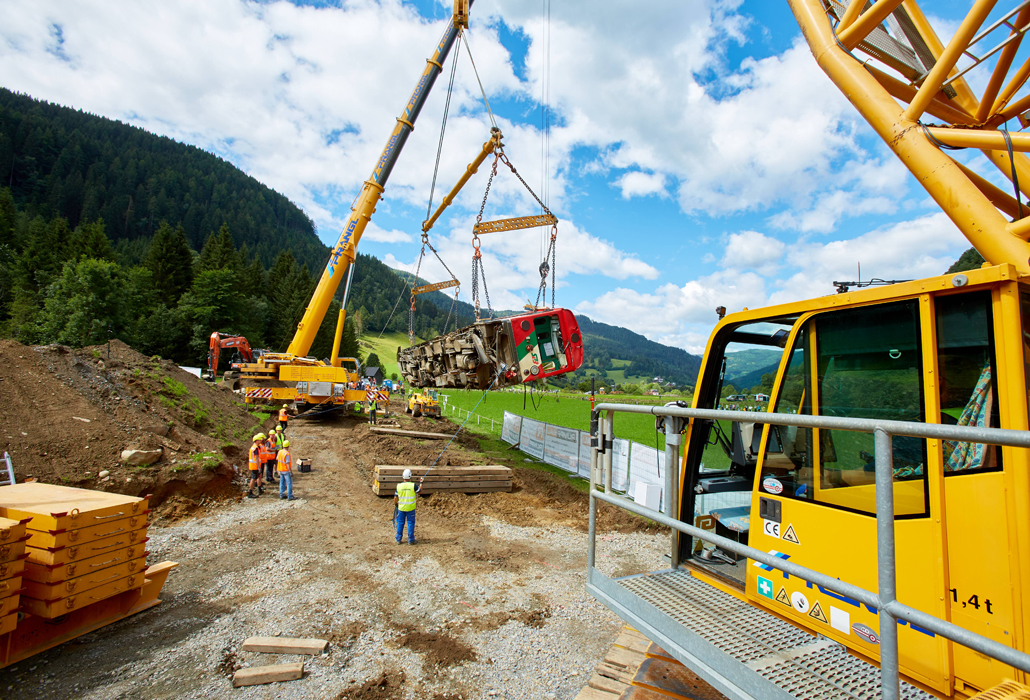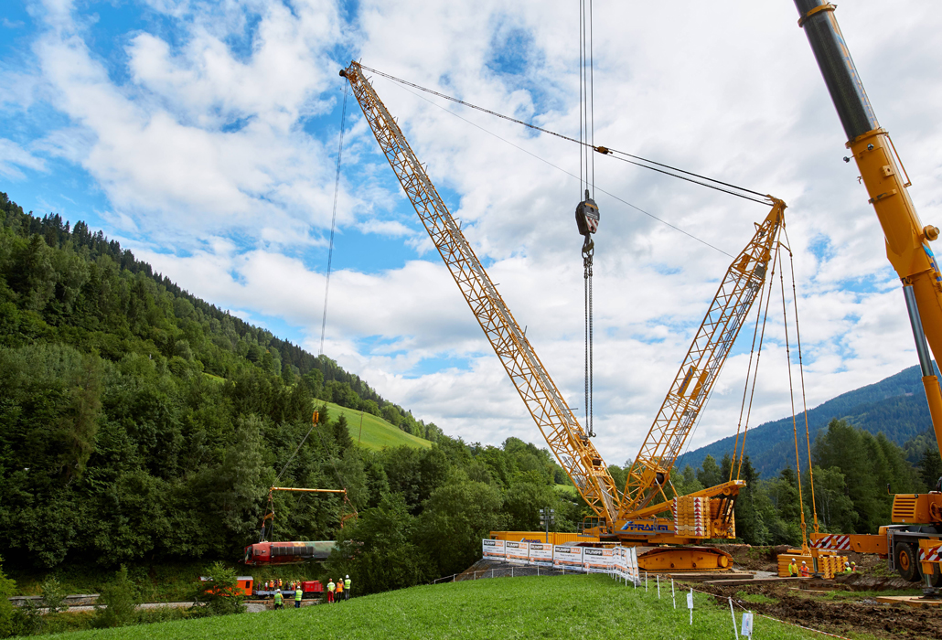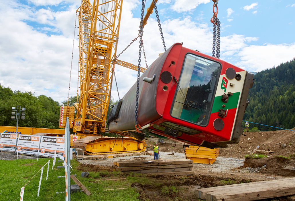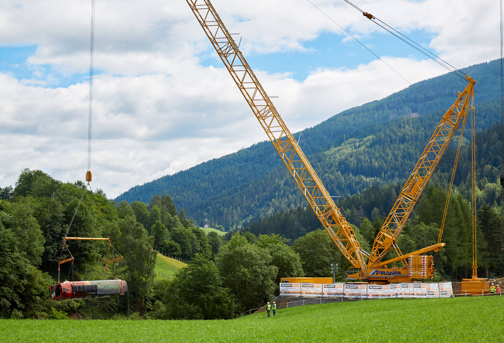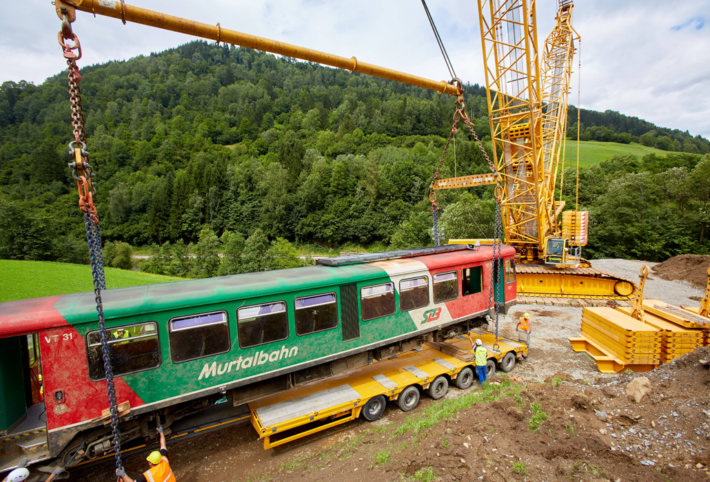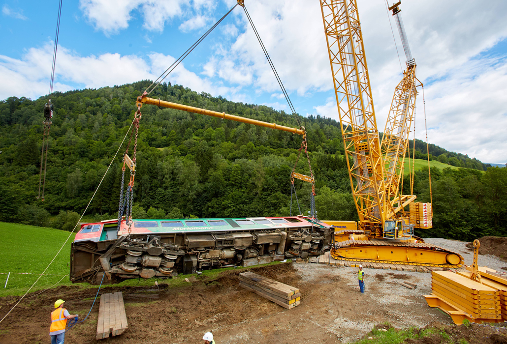 9. srpnja 2021. na prugi željeznice po dolini rijeke Mure željeznička kompozicija ispala je iz tračnica i pala u rijeku između Štajerske i Salzburga. Zbog lokalnih uvjeta brzo je postalo jasno da to neće biti samo još jedan običan posao podizanja. Za veliku dizalicu morali su se obaviti neki pripremni radovi: Prije svega morali smo napraviti 90 metara dugu pristupnu cestu. Kako bi mogli sigurno postaviti našeg žutog diva, morali smo izgraditi posebnu površinu od oko 600 četvornih metara. Kao da to ne bi bilo dovoljno, morali smo izraditi i posebnu opremu za podizanje.