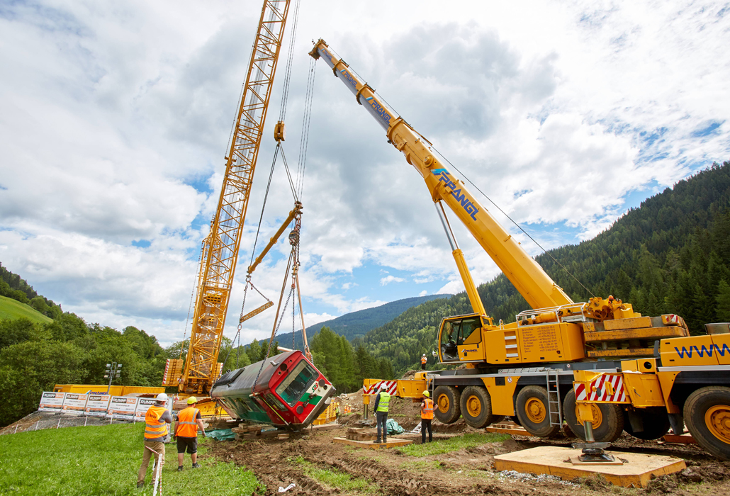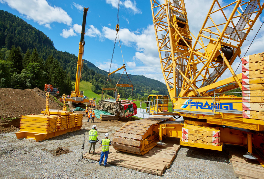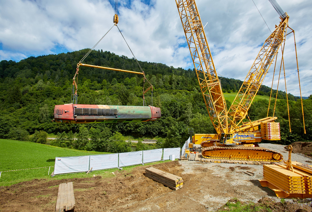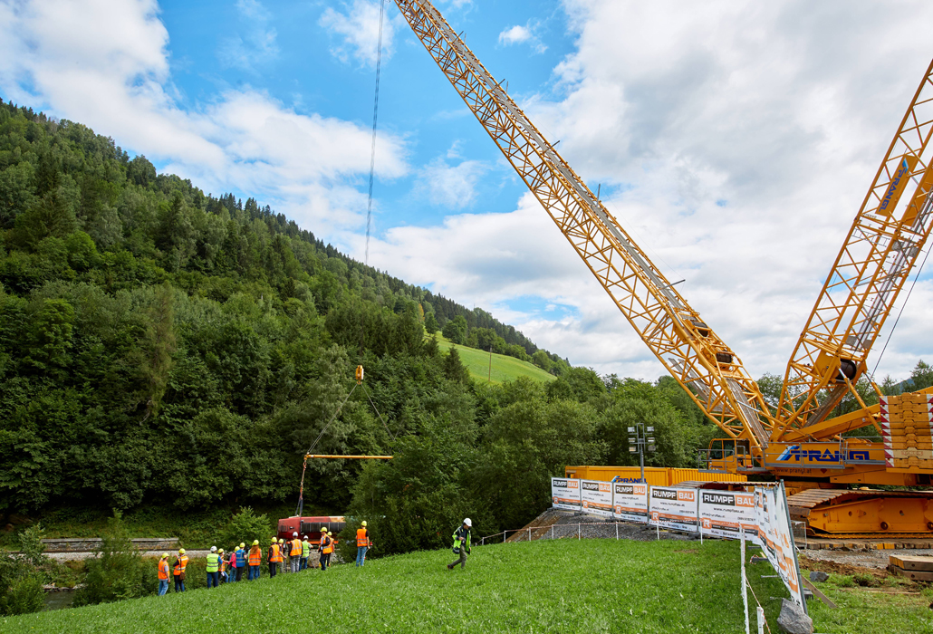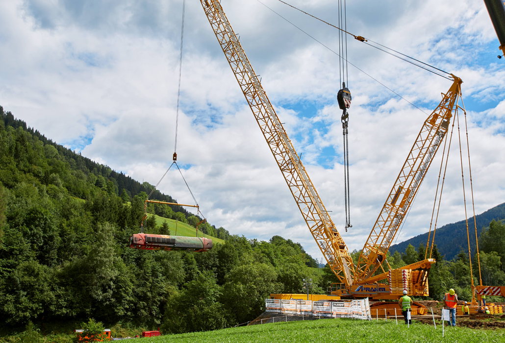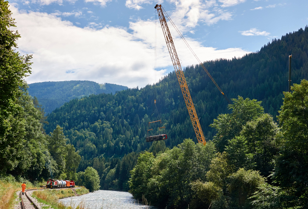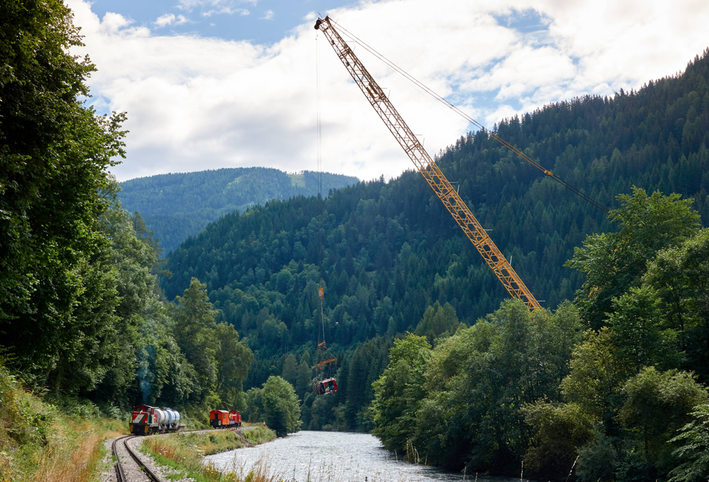 9. srpnja 2021. na prugi željeznice po dolini rijeke Mure željeznička kompozicija ispala je iz tračnica i pala u rijeku između Štajerske i Salzburga. Zbog lokalnih uvjeta brzo je postalo jasno da to neće biti samo još jedan običan posao podizanja. Za veliku dizalicu morali su se obaviti neki pripremni radovi: Prije svega morali smo napraviti 90 metara dugu pristupnu cestu. Kako bi mogli sigurno postaviti našeg žutog diva, morali smo izgraditi posebnu površinu od oko 600 četvornih metara. Kao da to ne bi bilo dovoljno, morali smo izraditi i posebnu opremu za podizanje.