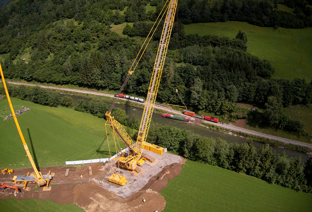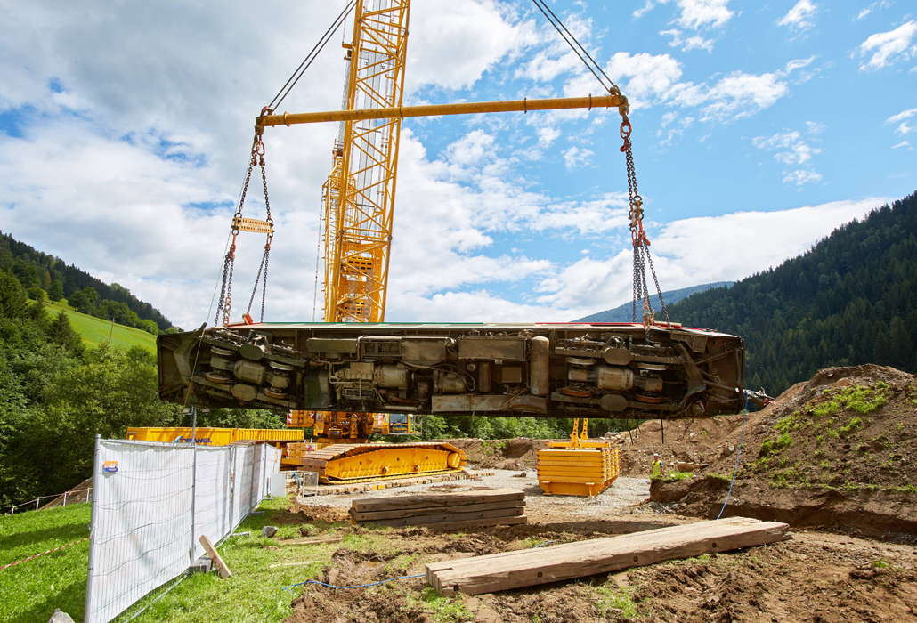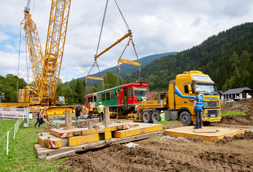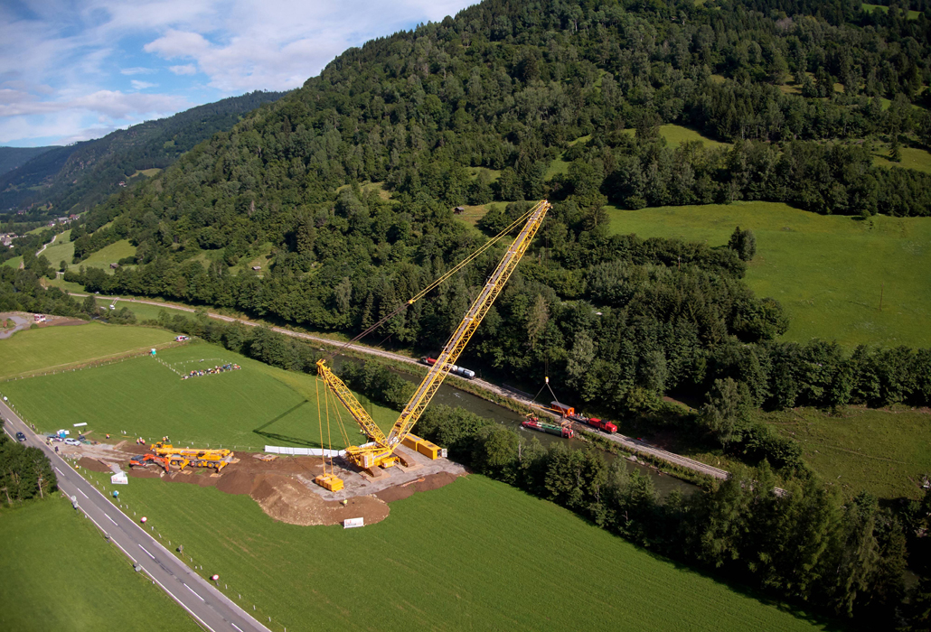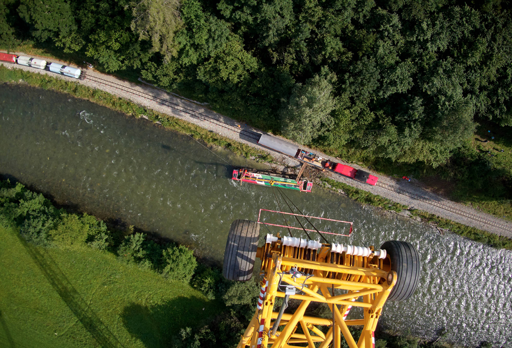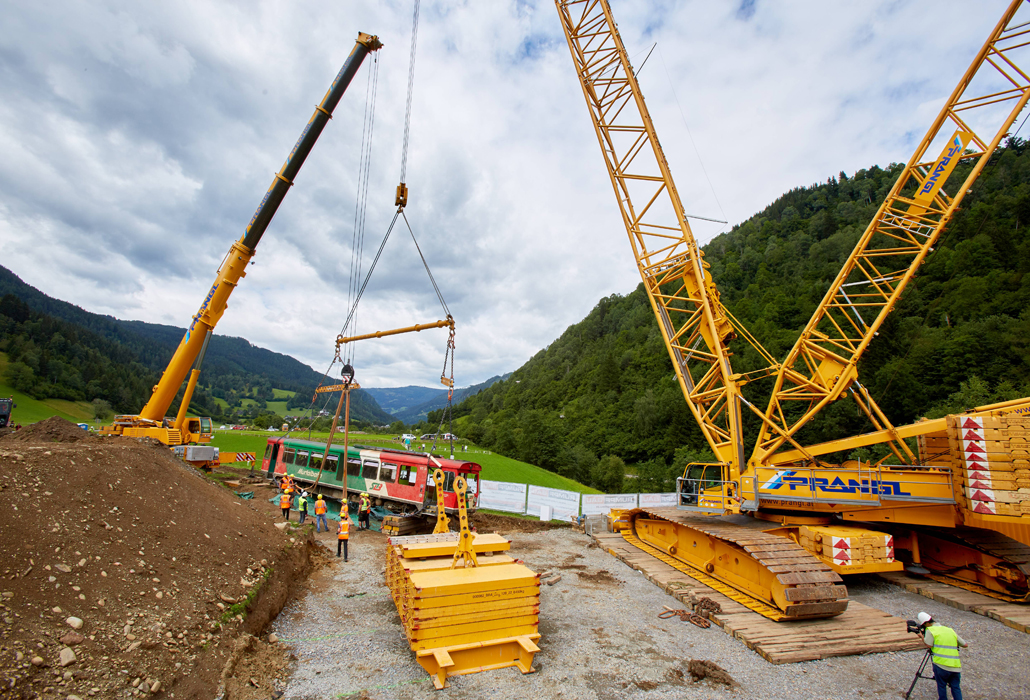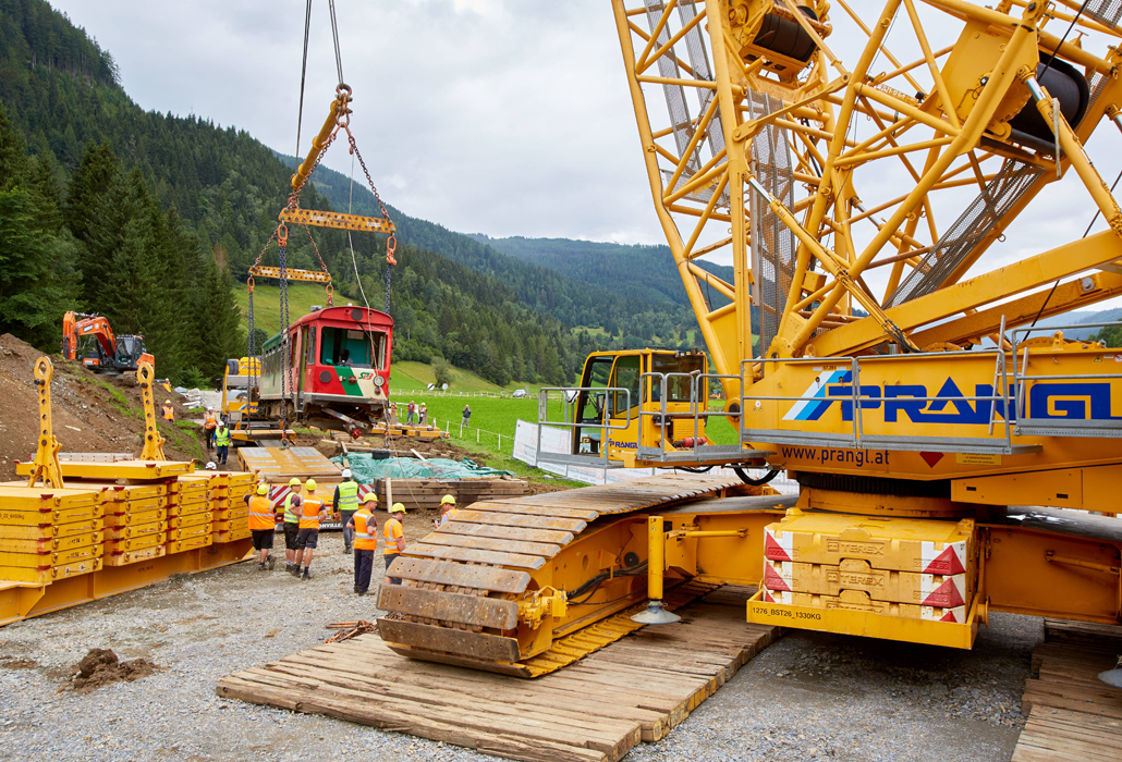 9. srpnja 2021. na prugi željeznice po dolini rijeke Mure željeznička kompozicija ispala je iz tračnica i pala u rijeku između Štajerske i Salzburga. Zbog lokalnih uvjeta brzo je postalo jasno da to neće biti samo još jedan običan posao podizanja. Za veliku dizalicu morali su se obaviti neki pripremni radovi: Prije svega morali smo napraviti 90 metara dugu pristupnu cestu. Kako bi mogli sigurno postaviti našeg žutog diva, morali smo izgraditi posebnu površinu od oko 600 četvornih metara. Kao da to ne bi bilo dovoljno, morali smo izraditi i posebnu opremu za podizanje.
