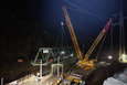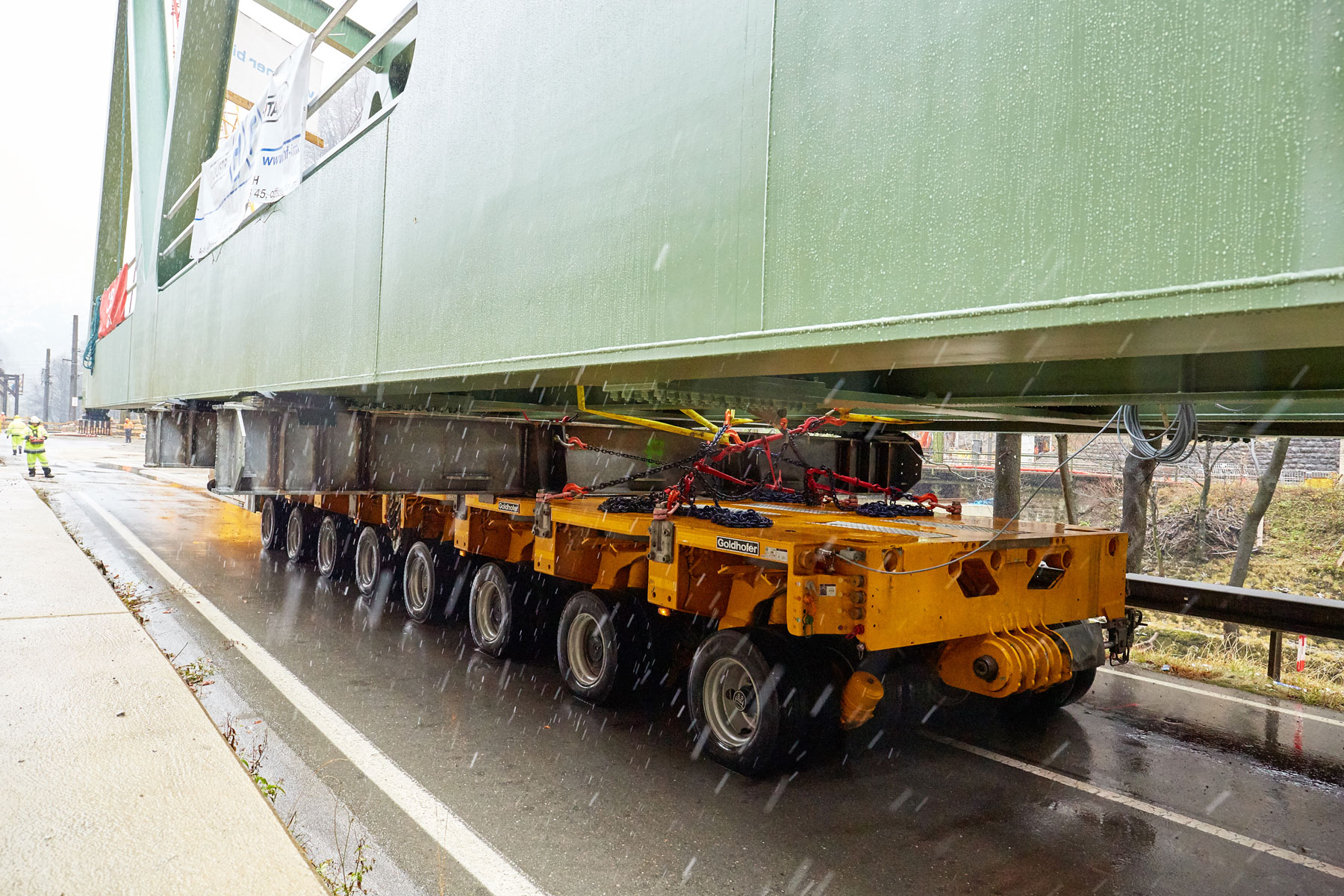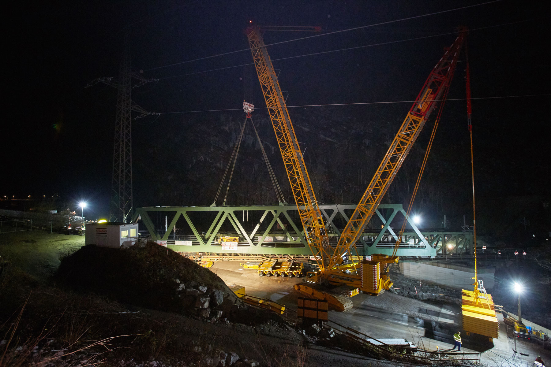 Konačno smo bili tako daleko: Ubrzo nakon što je zadnji vlak prošao tračnice u 02:00, počeo je stvarni rad na podizanju. Za prvi planirani vlak koji je trebao proći ujutro bilo je dostupno vremensko razdoblje od nešto manje od dva sata. Svi su sudionici bili pod ogromnim pritiskom. Dizalica je pokupila okvir izravno iz modula s vlastitim pogonom za teške uvjete rada. Zbog udaljenosti, dizalica na gusjenicama je morala promijeniti mjesto stajanja i pomaknuti se oko 20 metara pod punim opterećenjem.