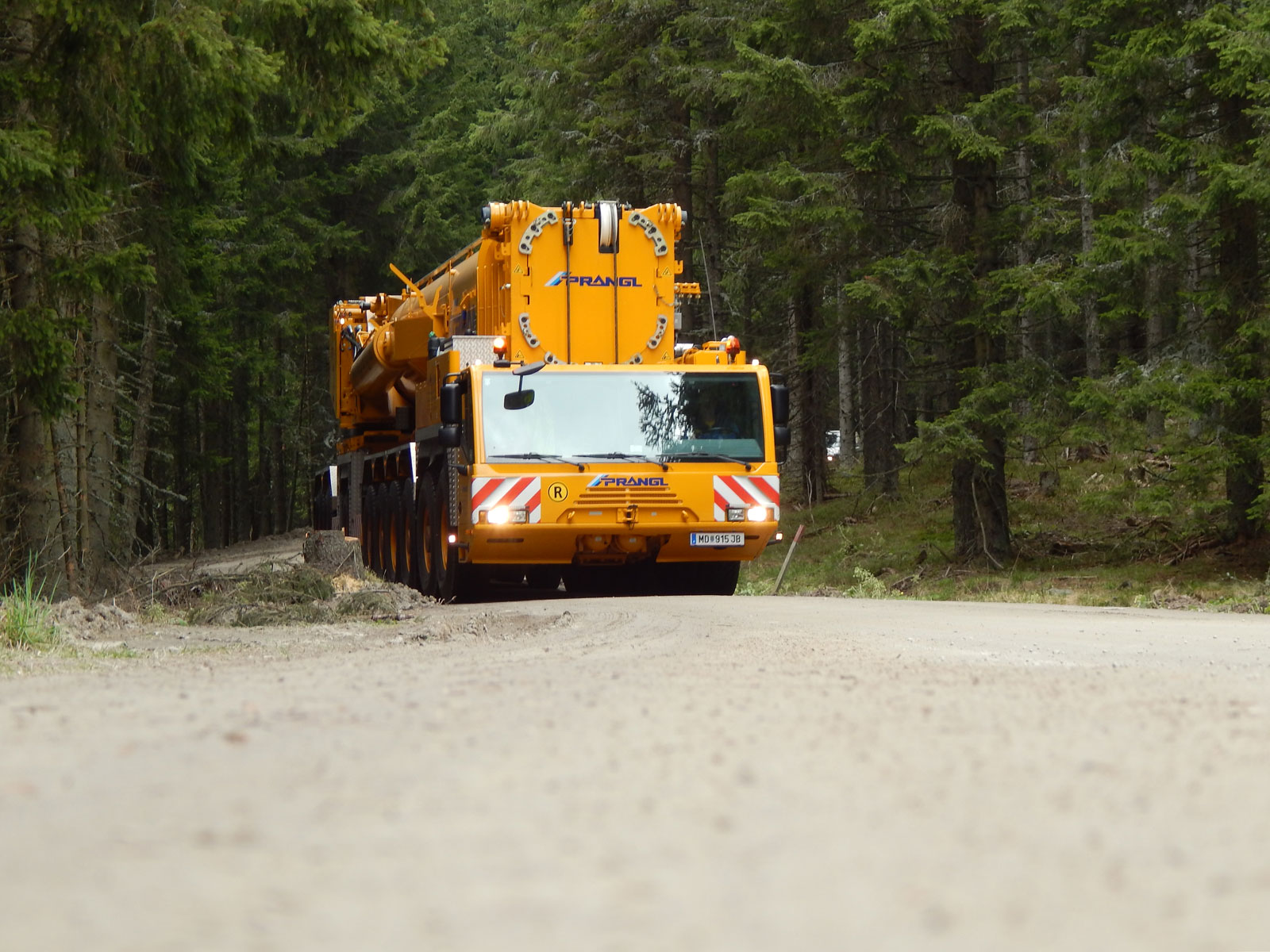 Kako bi mogli postaviti predviđenu dizalicu na gusjenicama koja teži 650 tona, ulica Salzachstraße je morala u fazama biti potpuno zatvorena. Ukupno 40 kamiona korišteno je za prijevoz svih dijelova velike dizalice, koja je zatim sastavljena u četiri dana u teškim uvjetima. Kada je u potpunosti sastavljena, divovska žuta dizalica, uključujući i teret, težila je 900 tona.