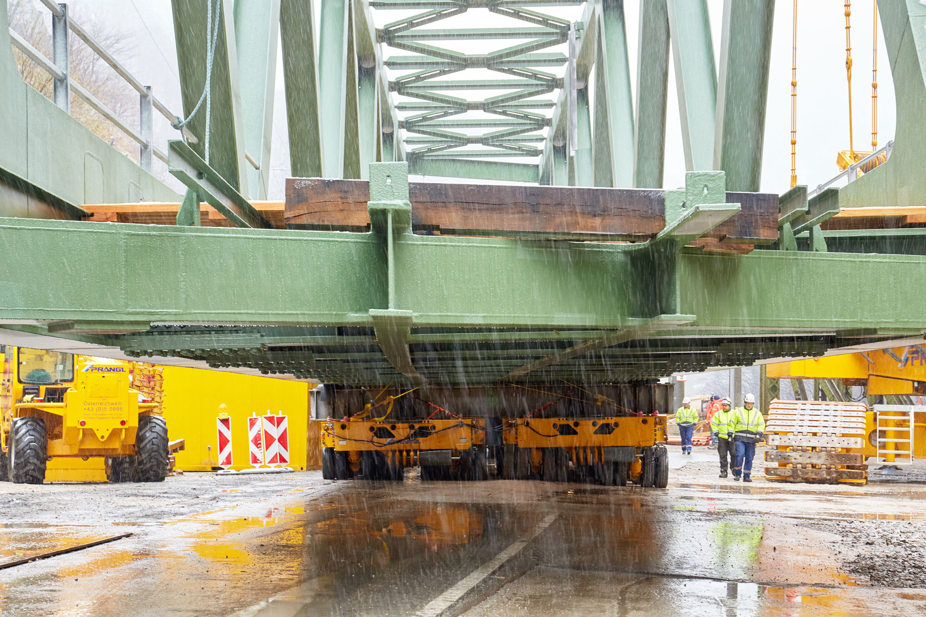 Prvi zadatak Prangl tima bio je da podigne stari okvir mosta, koji je težio ukupno 380 tona, stavi ga na tri sinkronizirana modula za teške terete i daljinskim upravljačem ga odveze do privremenog skladišta. Istodobno, novi se most morao pomaknuti oko 300 metara do mjesta za podizanje prije no što će biti transportiran. To je provedeno sa samohodnim jedinicama za teške terete. Zbog ograničenog prostora i duljine okvira od 70 metara, prva faza odmah je zahtijevala najveću koncentraciju svih sudionika.