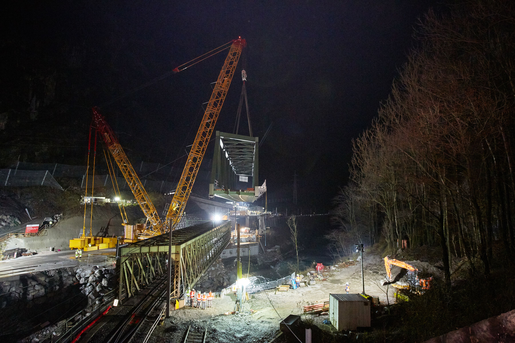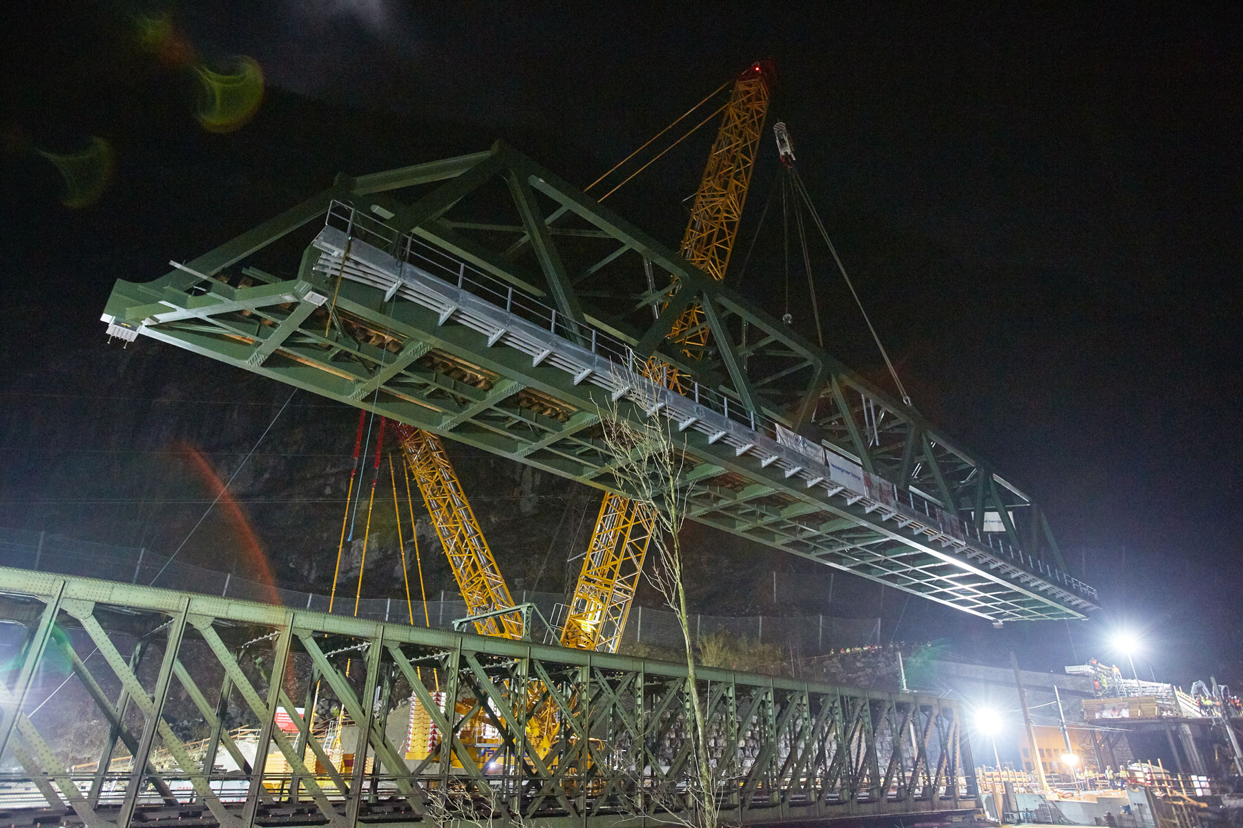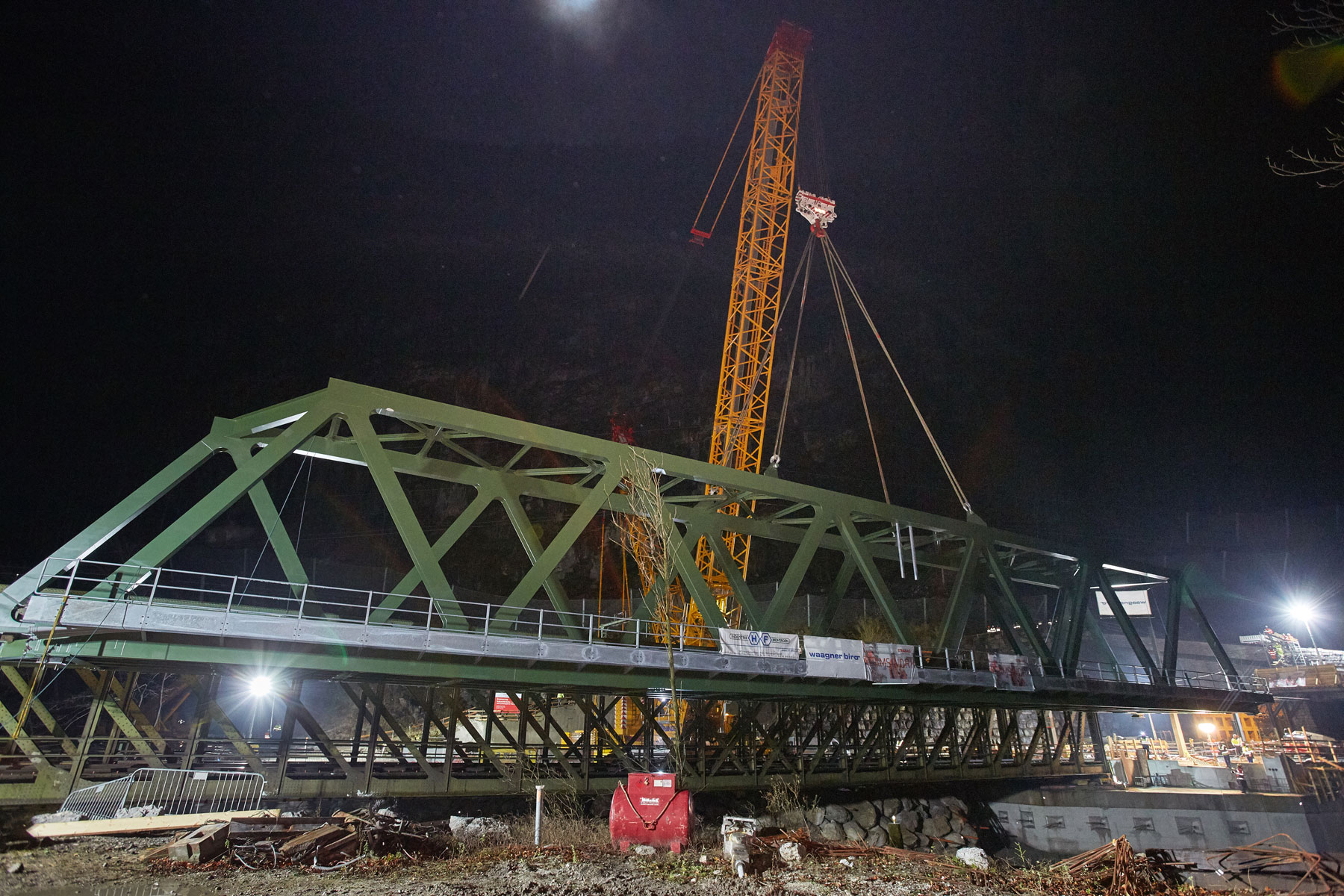 Usprkos teškim uvjetima vjetra, novi most je podignut s milimetarskom preciznošću. Kako se ne bi ugrozila postojeća potporna struktura susjednog drugog kolosijeka, obje operacije dizanja (stari i novi most) zahtijevale su najveću koncentraciju cijelog tima, budući da su strukture dužine 70 metara sada bile 20 metara iznad tla. Budući da se gradilište nalazilo neposredno iznad vode, a odmah ispod njega opasna klisura u rijeku Salzach, čitavu noć ispod gradilišta stajala je spasilačka ekipa za spašavanje iz vode.